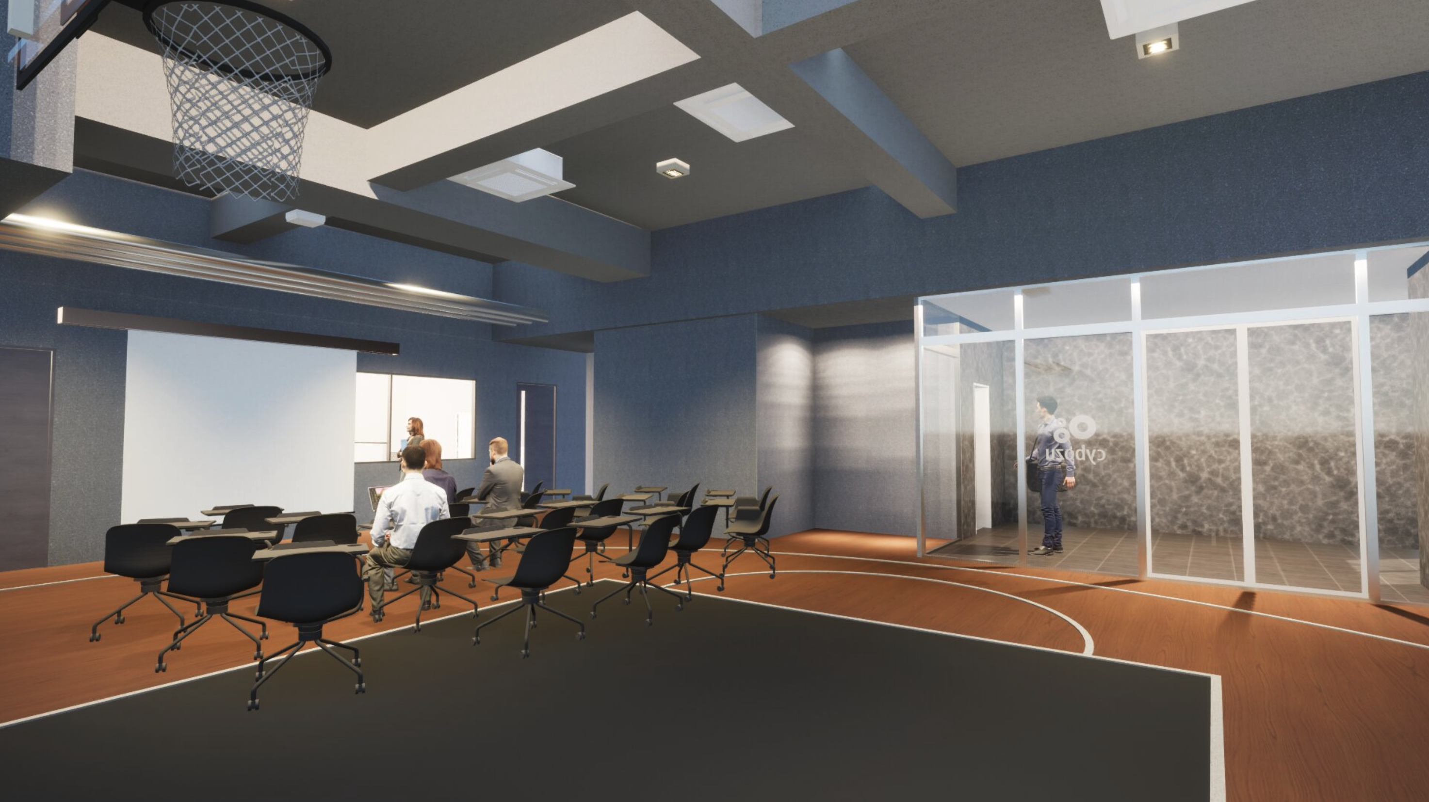 共用スペースには、バスケットボールチームらしいデザインを採用し、床にはコートのあしらいを施しているほか、壁にはゴールを設置しています。また、愛媛ならではの魅力を表現するため、伝統工芸である砥部焼の壁面タイルを取り入れています。
